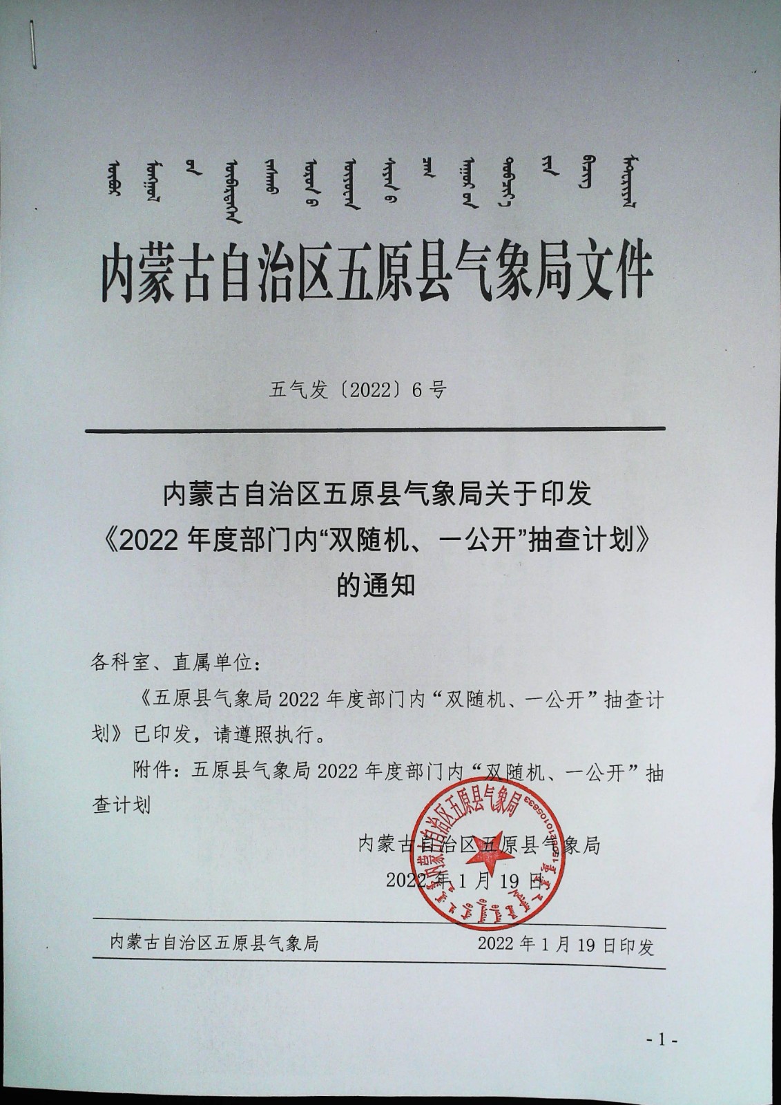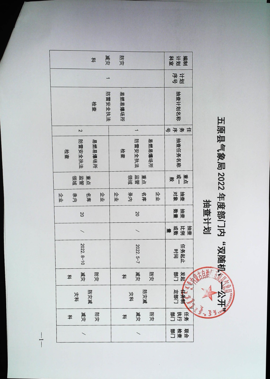 五原縣氣象局2022年度部門內“雙隨機、一公開”抽查計劃